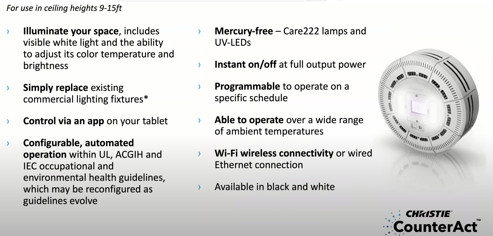 この製品は水平照射による部屋の上部空気(天井付近)消毒を担う265nmLEDと、人がいる空間(部屋下部)の表面および空間除菌用のCare222モジュール、そして既存の照明と交換できる可視光LEDの3つの光源を備えた「ハイブリッド空気質改善照明」です。