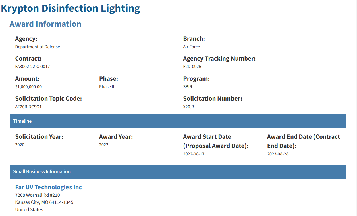 Care222公式パートナー企業であるFar-UV Technologies社は米国空軍のSBIR(Small Business Innovation Research)制度でフェーズ2まで進んでおり、100万ドルの開発資金を得ています。